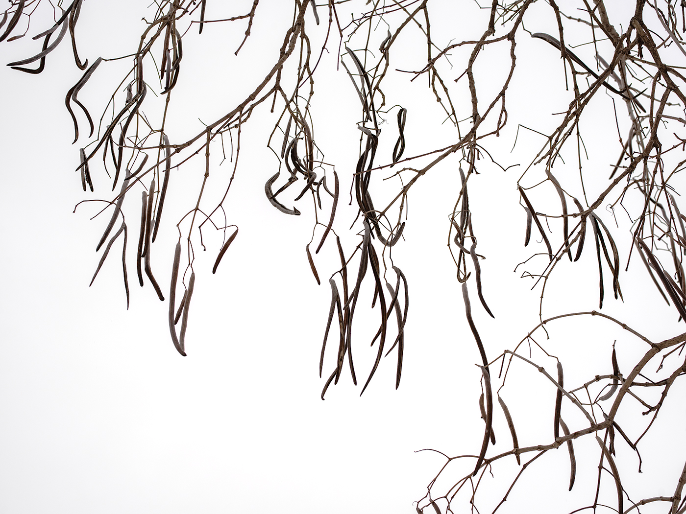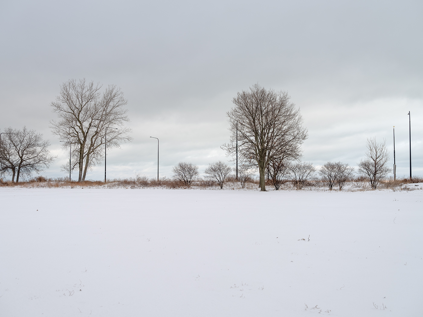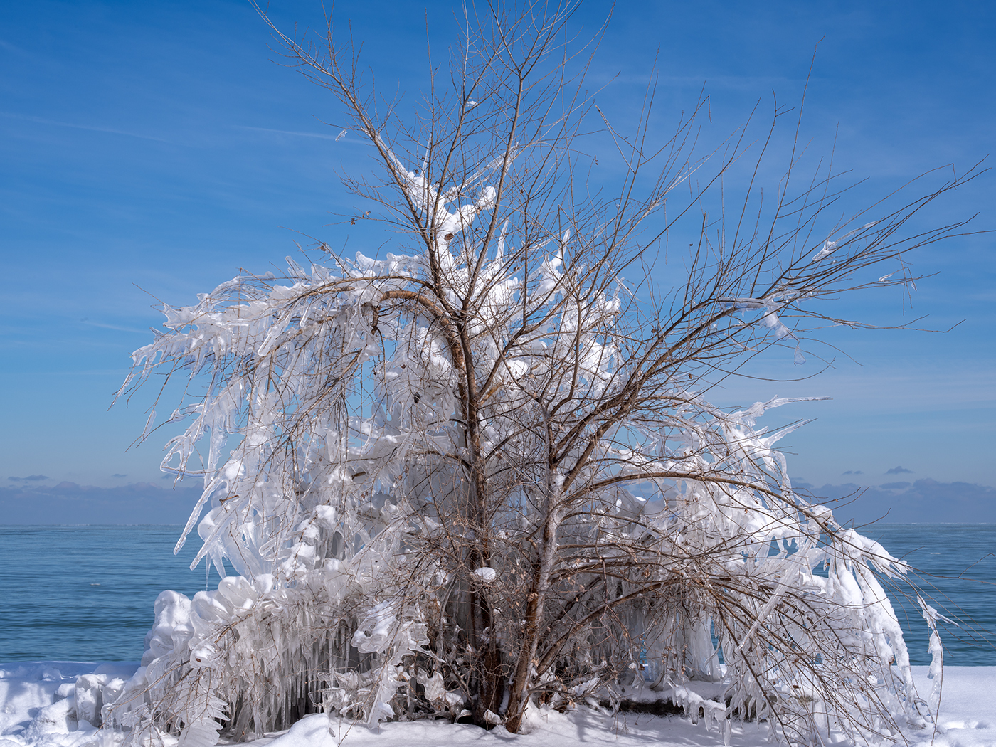 The trees found in, The Shore, 2025, are all denuded of leaves. Those closest to the water often becoming covered in ice as winds toss the lake waters onto shore in wintertime. Their dark branches stand in stark contrast to the sky above.