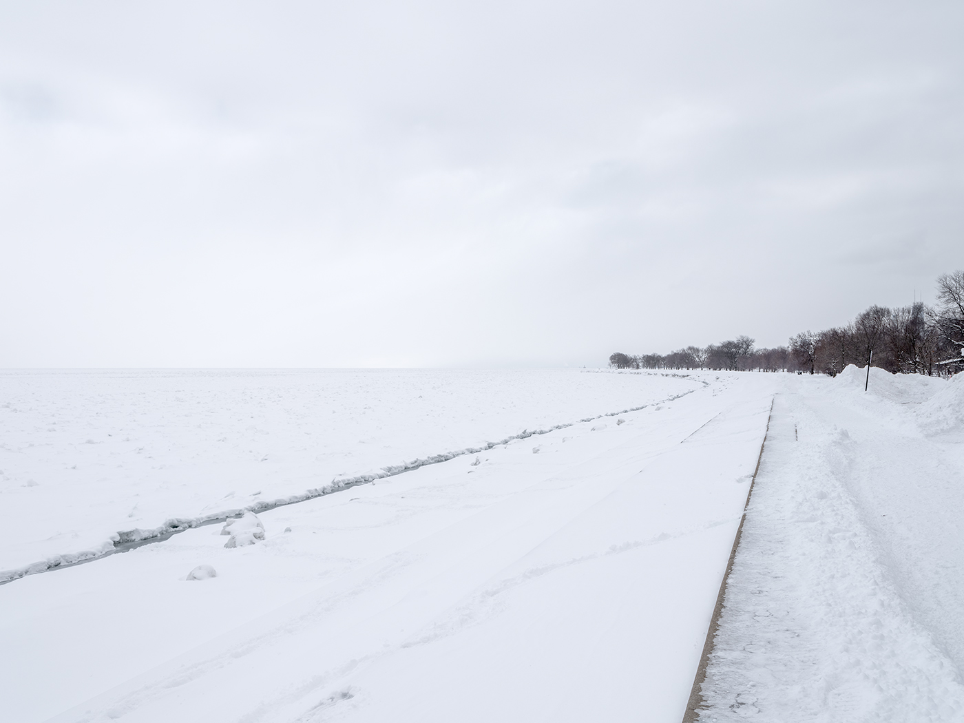 “Standing on the shore overlooking Lake Michigan, deep in winter, my eyelashes freeze to the camera viewfinder as I photograph. The camera image enters my eye and I see a lake transformed into a solid expanse that extends out to the horizon. I feel my feet on the frozen ground, I too am part of this landscape. This temporal moment will give way to a new one tomorrow when I return again to photograph. In a few months I will be swimming in the lake at this very spot, it is almost impossible to imagine this possibility deep in winter.”