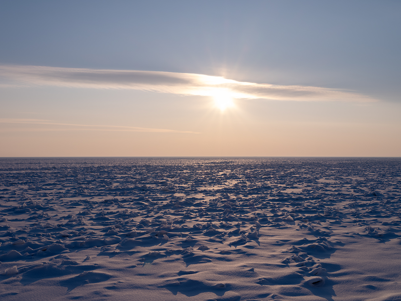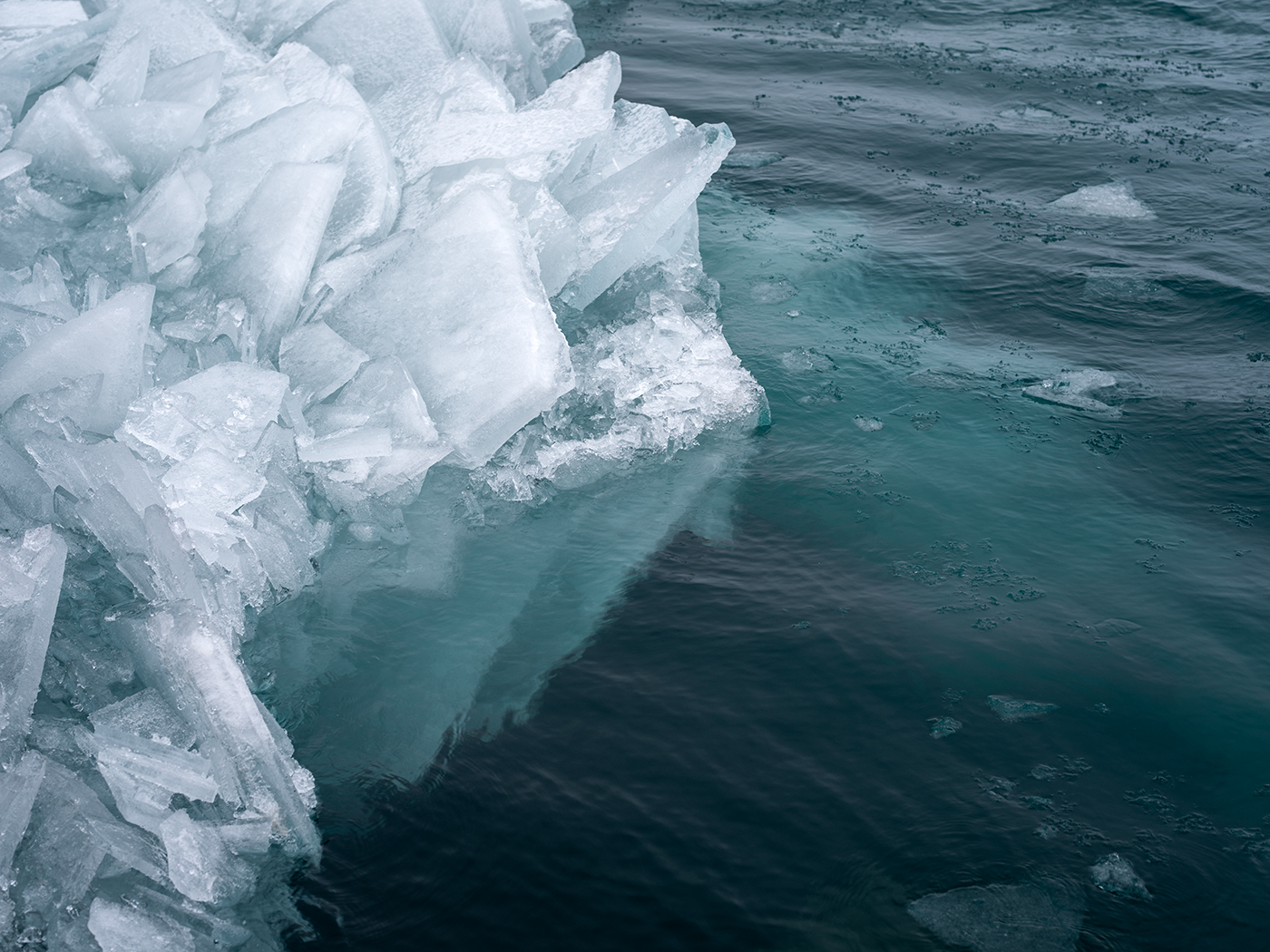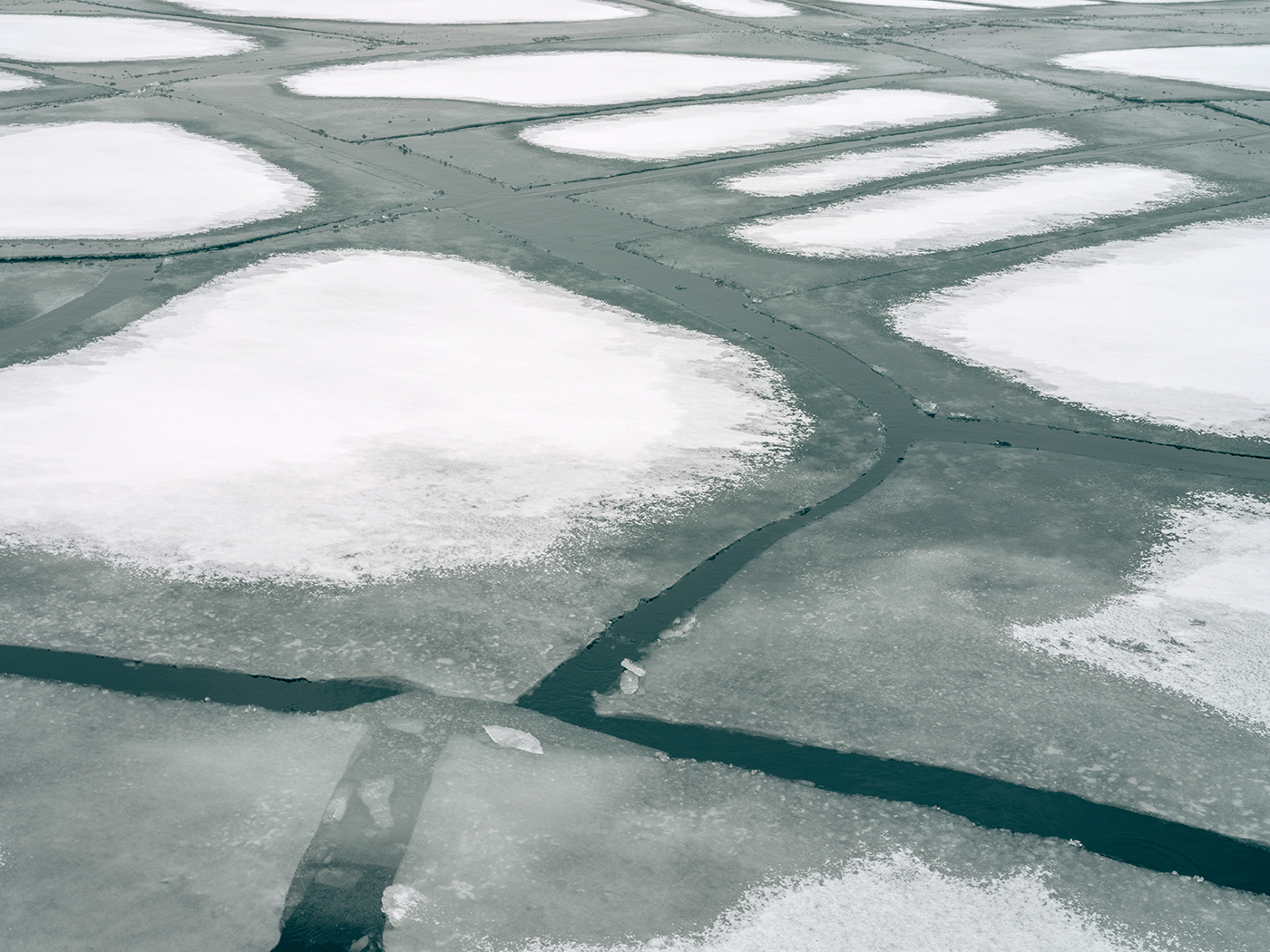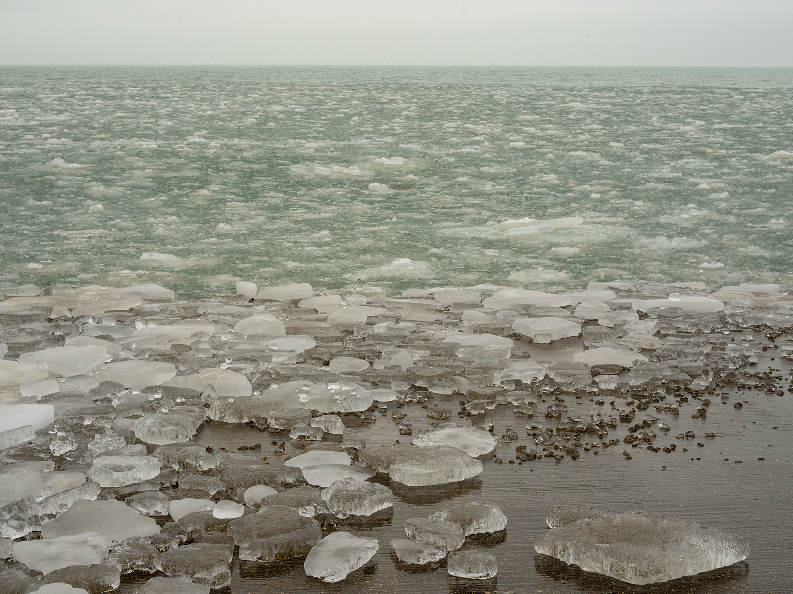 In winter the near shore lake freezes solid. Joining and extending the land out onto the water. Large pieces of ice join together, creating a terrestrial surface filled with texture and pattern. As time passes and temperatures warm and cool, the ice changes form before eventually turning back into water.