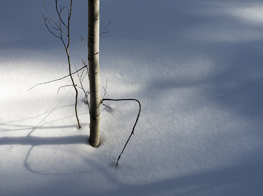 This photograph, Alpine Solstice I, was taken in the mountains outside of Ashcroft, Colorado. Soft winter light creates shadows in the snow while simultaneously illuminating the bark on a young Aspen tree.