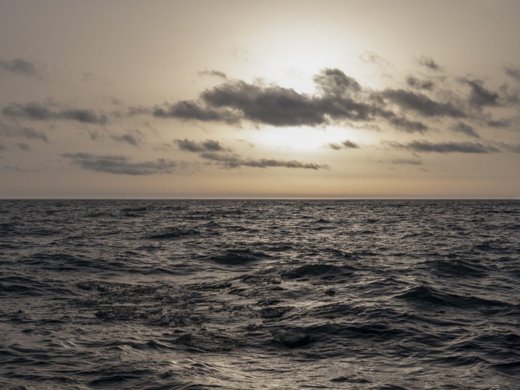 A metallic toned morning on Lake Michigan and the waters are moving restlessly in the winds moving quickly as a bronze sunrise on Lake Michigan occurs. The sun is momentarily obscured by clouds, the last ice of winter appears in the lake waters. The light is filtered heavily by the haze in the sky. Creating the curious color on this day.