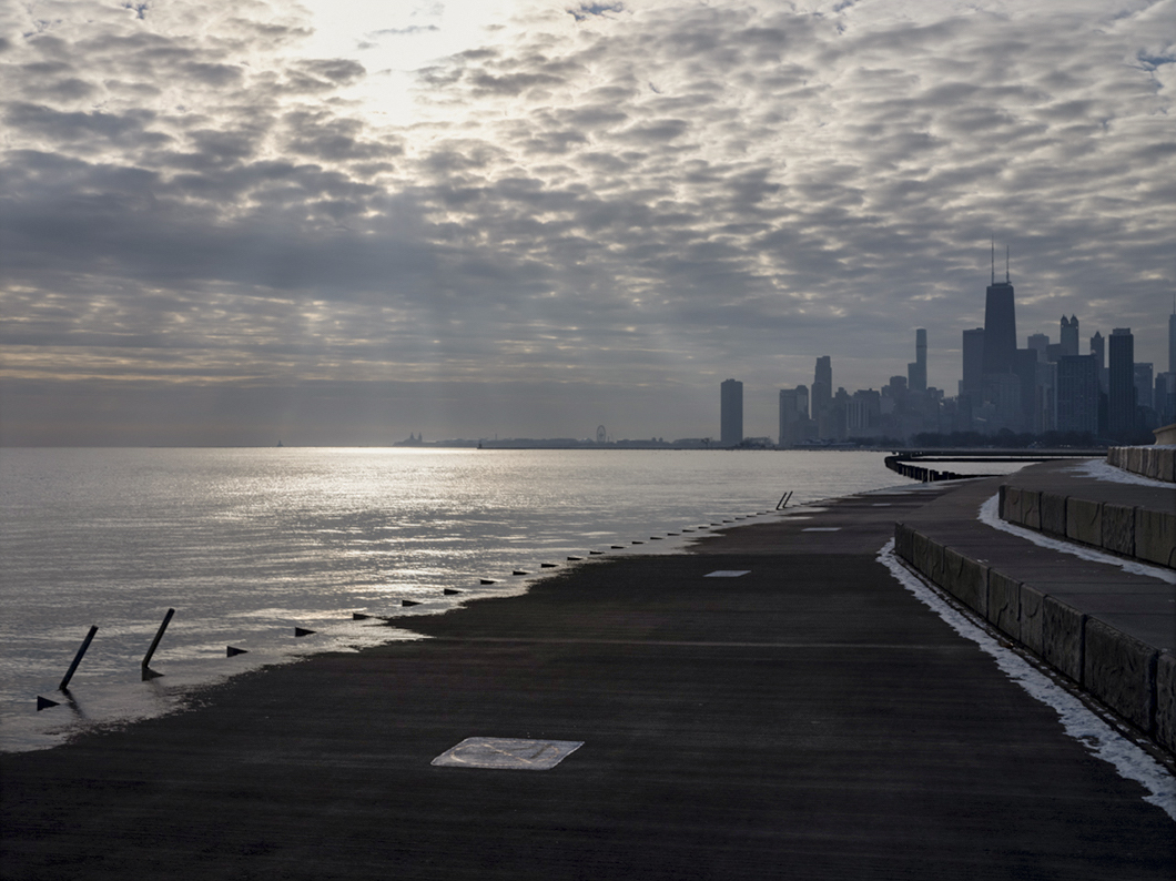 A late December day and the skyline of Chicago is illuminated in sunlight as it passes through clouds. A series of cold days came through during this time. The lakefront becoming quiet as the temperatures dropped.