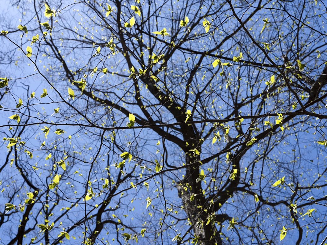 The first leaves of spring are beginning to appear illuminated by the sun. The sky above is perfectly clear and blue. It’s been a spring of fits and starts, but on days like this, you can feel summer coming.