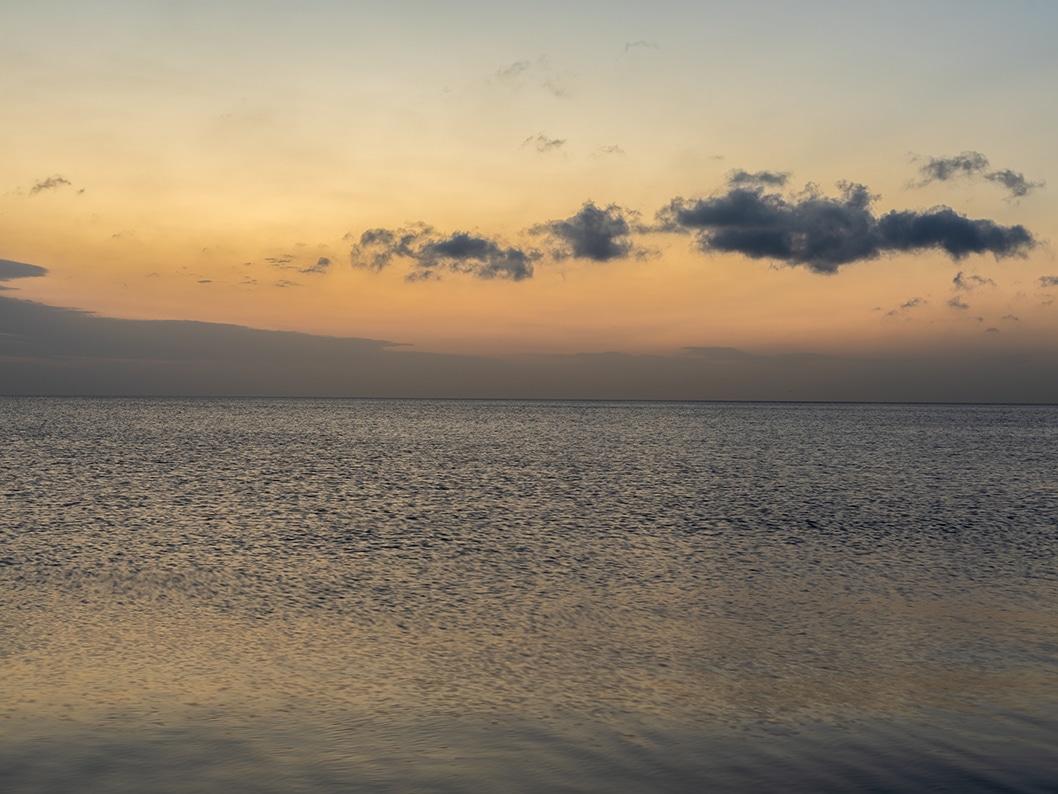 Golden dawn light on Lake Michigan transforms the waters. Reflecting in the surface the warm light in the sky. Clouds sit overhead moving languidly as the day begins.