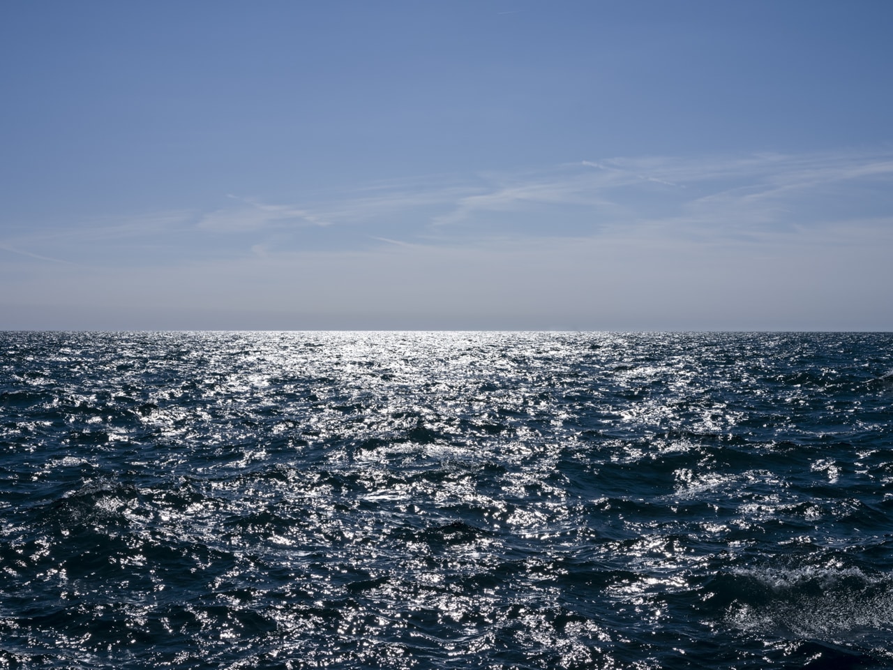Sunlight reflects off dark waters. Water and light shimmering together. The dark surface of the lake in high contrast to the sunlight. Clouds are starting to appear in the sky as strong winds push large waves higher in the air.