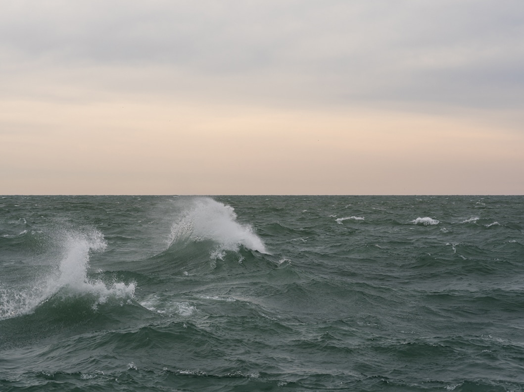 Waves crash on Lake Michigan. The water spraying into the air. The sky is peach in color, the waters a jade green. This is March 5th, 2018, from the Lake Series.