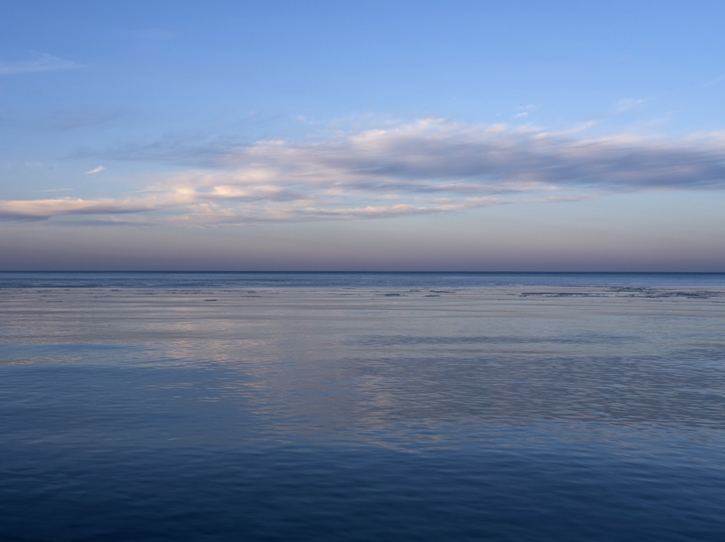 A winter lake dawn brings soft clouds to the blue skies above a calm Lake Michigan. The sky gently reflected and translated in the surface of the lake. From February 28, 2022.