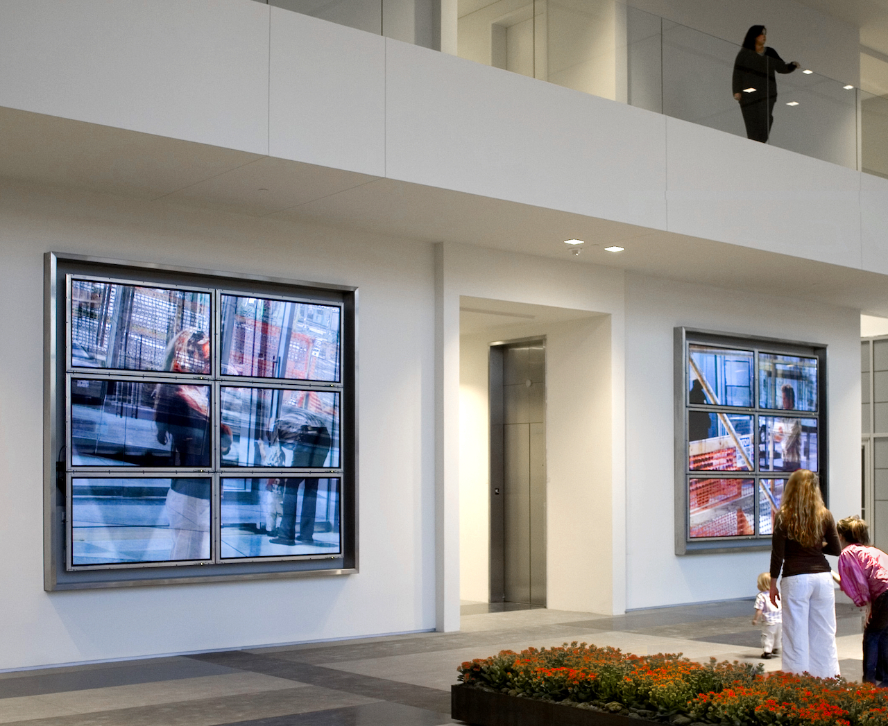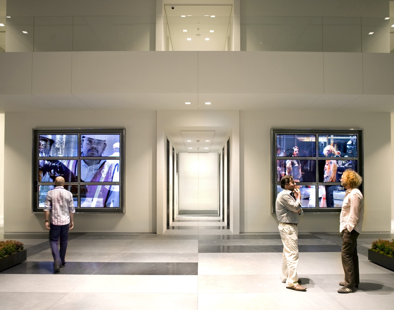From the artworks inception, two high definition cameras begin randomly recording and storing slices of memories from the lobby environment. These recordings create a massive digital library that the artwork in turn creates in real time in four overlapping layers, literally building a visible, transparent, and fluid memory of One Arts Plaza and its visitors over time.